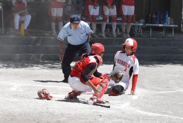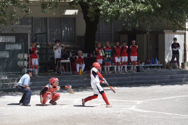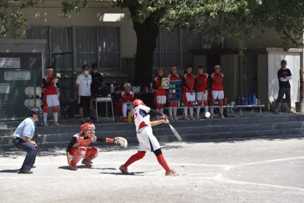 6番バッターは見逃し三振でスリーアウト。3年生、2年生が積極的なバッティングで10分足らずで、初回で大きな3点を入れました。