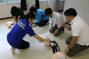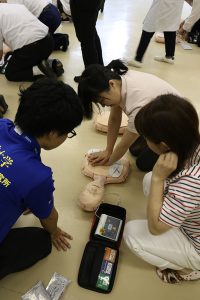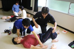 国士舘大学防災・救急救助総合研究所の方々をお招きし、胸骨圧迫法やAED・エピペンの使用方法についてご指導いただきました。